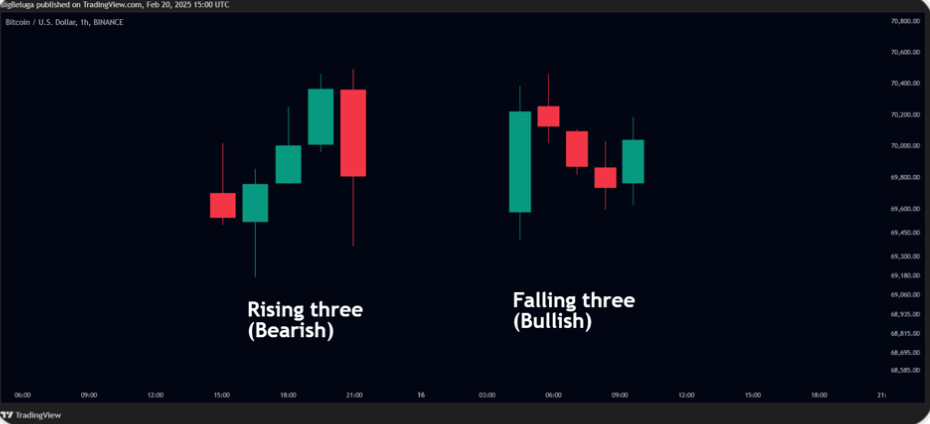 - A long bullish candle followed by three small bearish candles (temporary pullback), and another long bullish candle that confirms the uptrend.