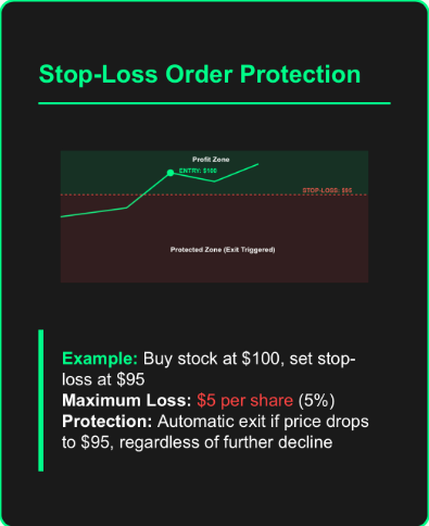 A stop-loss automatically closes a trade once it hits a predetermined loss level, serving as your safety net that limits damage when the market moves against you. Here’s a practical example: You buy a stock at $100 and set your stop-loss at $95. The most you’ll lose is $5 per share, no matter if the stock drops to $50 overnight due to unexpected news.