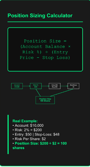 Position sizing determines how many shares to buy based on your account size and risk tolerance. Here’s the basic formula: