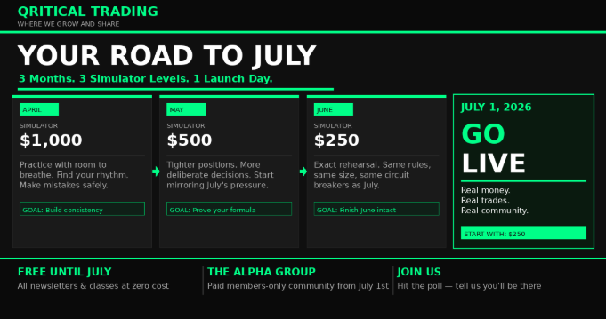 Access the resources. Every newsletter, every class, every resource on the QRITICAL TRADING website - zero cost until July 1st. Use these three months to absorb as much as you can.